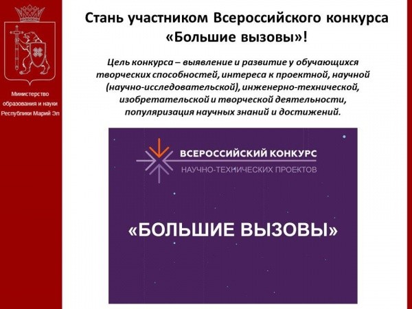 Школьники с 7 по 11 класс и студенты первых двух курсов могут стать участниками Всероссийского конкурса научно-технологических проектов «Большие вызовы».  В Марий Эл стартовал отборочный этап конкурса.