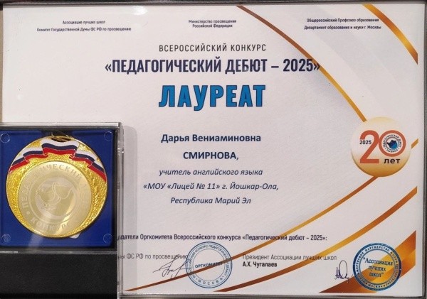 Учитель английского языка Лицея №11 им. Т.И. Александровой Дарья Вениаминовна Смирнова стала лауреатом в номинации «Молодые учителя», сообщил в своем тг-канале Глава Марий Эл Юрий Зайцев.