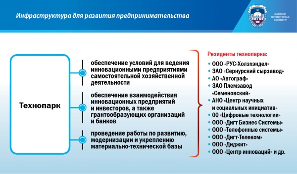 Для развития предпринимательской деятельности в МарГУ за последние годы создана развитая инфраструктура, в которую входят малые инновационные предприятия, технопарк, центр коллективного пользования и бизнес-инкубатор.