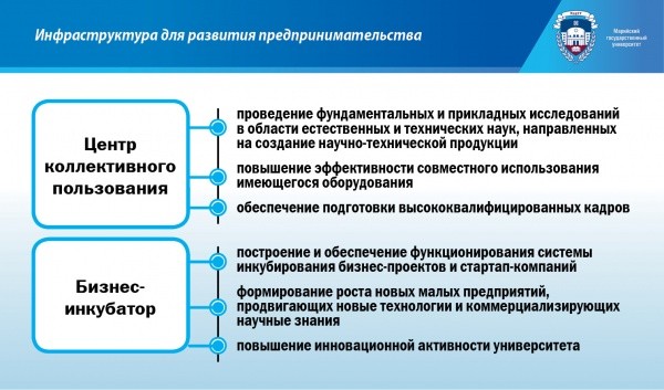 В инфраструктуру для развития предпринимательства в МарГУ входят центр коллективного пользования и бизнес-инкубатор. В сфере деятельности центра коллективного пользования – проведение фундаментальных и прикладных исследований в области естественных и прикладных наук, направленных на создание научно-технической продукции, а также подготовка высококвалифицированных кадров. Бизнес-инкубатор в свою очередь занимается построением и обеспечением функционирования системы сопровождения бизнес-проектов и стартап-компаний, стимулированием роста новых малых предприятий, продвигающих технологии и коммерциализирующих научные разработки, повышением инновационной активности университета.