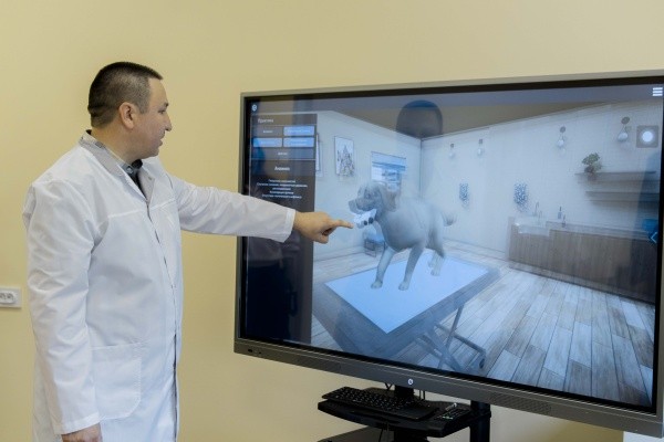 Ключевой элемент кабинета – виртуальный тренажер ветеринарного врача. Программа на базе трёхмерной графики и анимации имитирует полноценный клинический приём: студенты проводят виртуальный осмотр, выполняют инструментальные исследования и ставят первичный диагноз по заранее проработанным сценариям. Система охватывает диагностику заболеваний свиней, крупного рогатого скота и собак. Интерактивные 3D-модели животных реагируют на манипуляции в реальном времени, что позволяет обучаемым последовательно выполнять стандартные процедуры, формировать диагноз и выбирать оптимальную стратегию лечения.