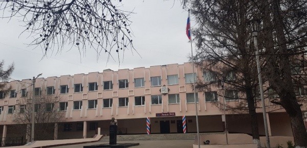 У здания школы построен плац с горизонтальной разметкой и флагштоком.