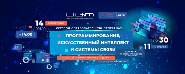 14 апреля в 14:00 Институт цифровых технологий МарГУ (г. Йошкар-Ола, ул. Машиностроителей, 15 (корпус «Е») приглашает выпускников образовательных учреждений и их родителей на презентацию новой сетевой образовательной программы «Программирование, искусственный интеллект и системы связи», которая реализуется совместно с Московским физико-техническим институтом. Всех участников ждут экскурсии в Инжиниринговый центр и по кампусу вуза, общение с работодателями и представителями института и, конечно, памятные сувениры.