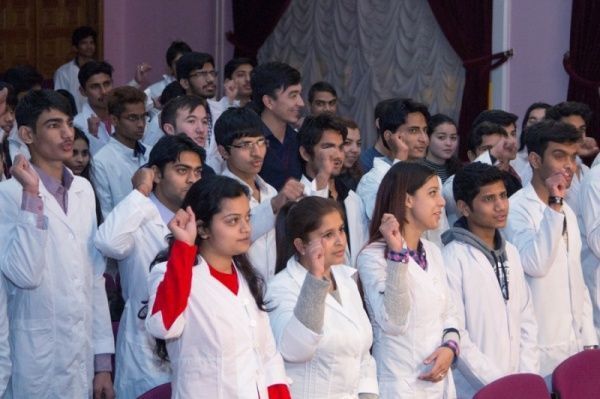 Вместе с директором Института медицины и естественных наук Ольгой Воскресенской индийцы надели белые халаты и произнесли клятву студента-медика. Кстати, клятва впервые в истории МарГУ прозвучала на английском языке, так как обучение студентов из Индии проводится на «инглиш» специально подготовленными и сертифицированными преподавателями.