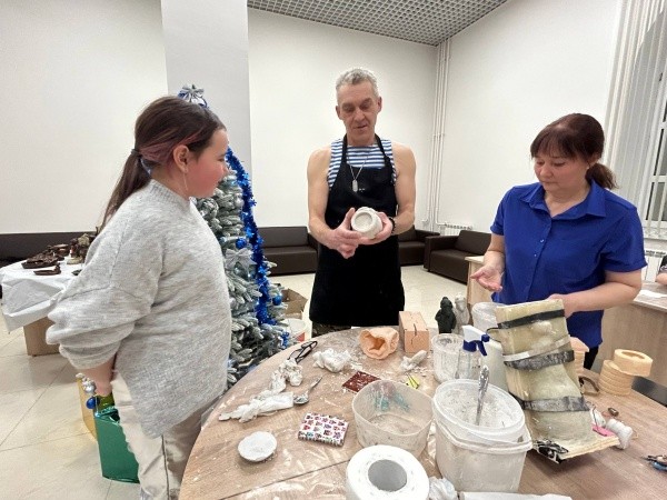 Андрей Семейшев увлекается созданием сказочных персонажей из гипса. Об этом узнали Надежда Антипина и Екатерина Шляхова, и предложили ему провести творческое занятие для семей воинов спецоперации. В прошлом году Андрей вместе с ребятами из Сернурского и Куженерского районов создавали змею – символ уходящего года, и решили сделать такие занятия новогодней традицией,