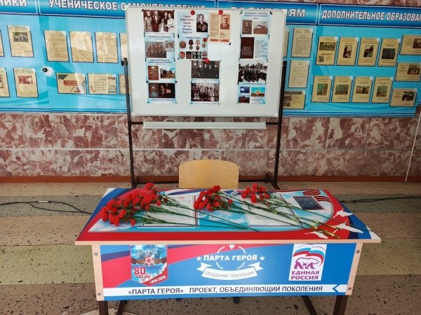 «Парта Героя» – это ученический стол, на котором размещена фотография Героя, информация о фактах его биографии и заслугах. Право сидеть за этой партой присуждается ученикам за отличные отметки, а также за активную общественную работу по итогам четверти.