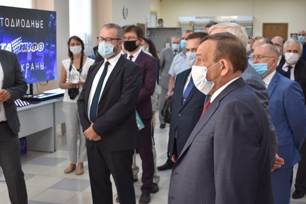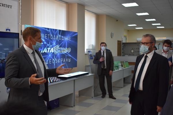 Затем почетные гости запустили маятник Фуко, который установлен в корпусе, и отправились в Инжиниринговый центр, где им рассказали о научной деятельности МарГУ в сфере радиолокаций.