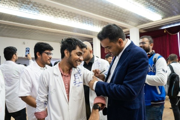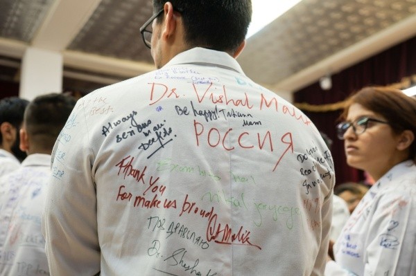 Как рассказали в вузе, у выпускников-медиков из Индии есть необычная традиция - перед получением дипломов они оставляют на белых халатах однокурсников записки на память - кто-то желает друзьям счастья в жизни, кто-то - успехов в карьере.
