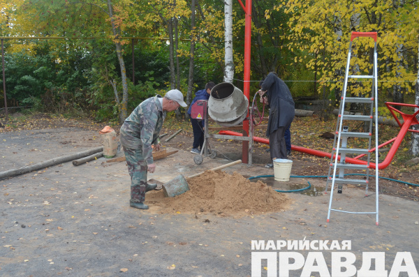 Строители заасфальтировали площадку 36 на 12 метров, были закуплены стойки с баскетбольными щитами. Кстати, удовольствие очень недешевое – за две «штучки» пришлось отдать 51 тысячу рублей. В результате денег на все про все не хватило и опоры со щитами директор школы с завхозом устанавливали самостоятельно при помощи старшеклассников. Момент строительства мне как раз удалось запечатлеть на фотоаппарат.