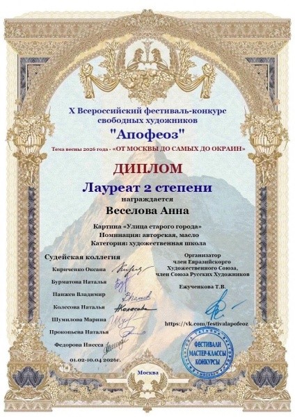Студентка 2 курса специальности «Живопись» Йошкар-Олинского художественного училища Анна Веселова стала лауреатом второй степени Всероссийского фестиваля свободных художников «Апофеоз» в конкурсе «От Москвы до самых окраин».