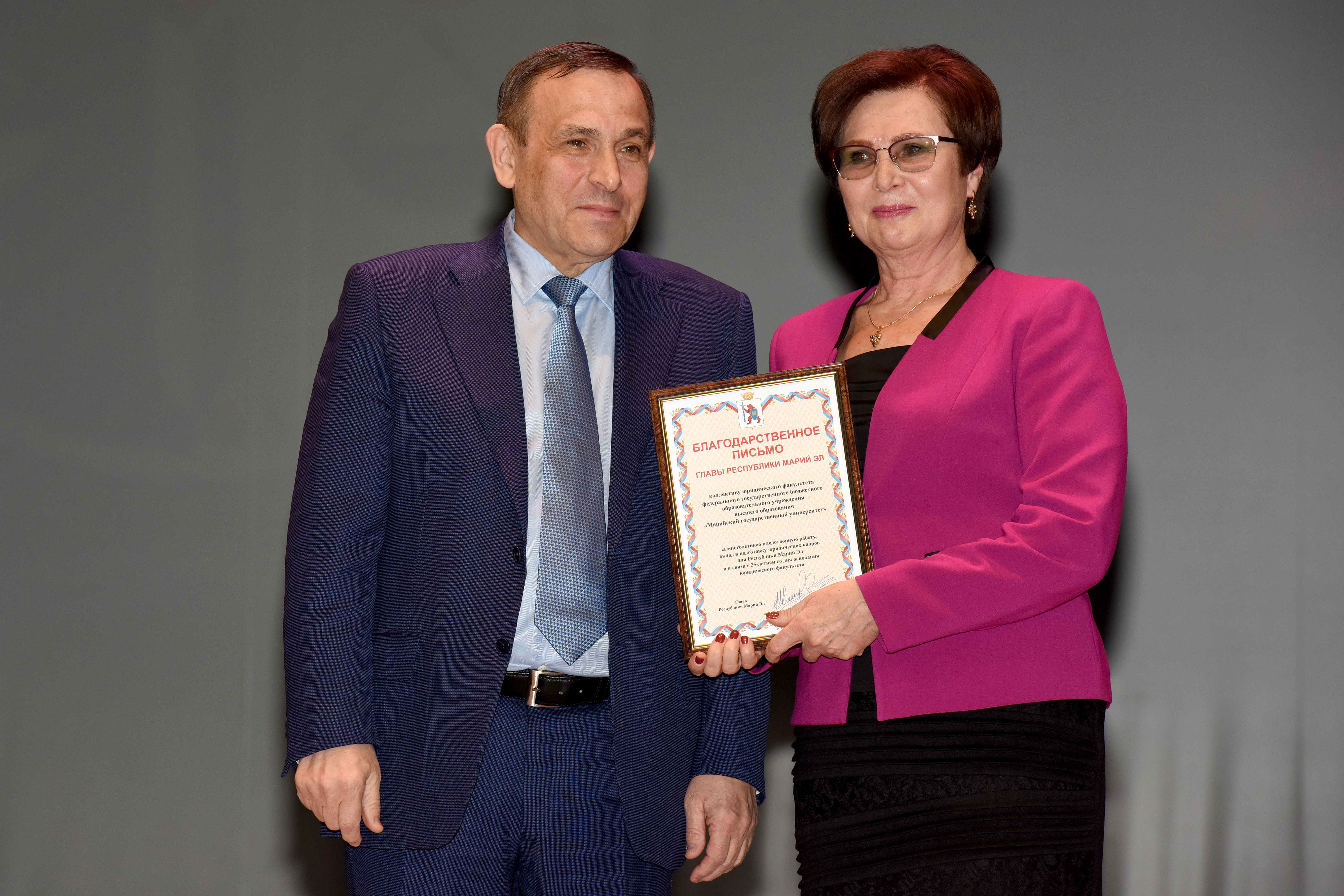 За многолетнюю плодотворную работу, вклад в подготовку юридических кадров для республики и в связи с 25-летием со дня основания юридического факультета коллективу МарГУ в лице декана было вручено благодарственное письмо Главы Марий Эл, сообщает Организационно-аналитическое управление Главы Марий Эл.