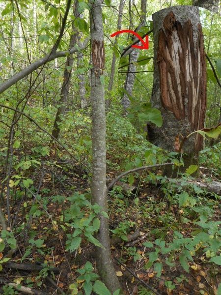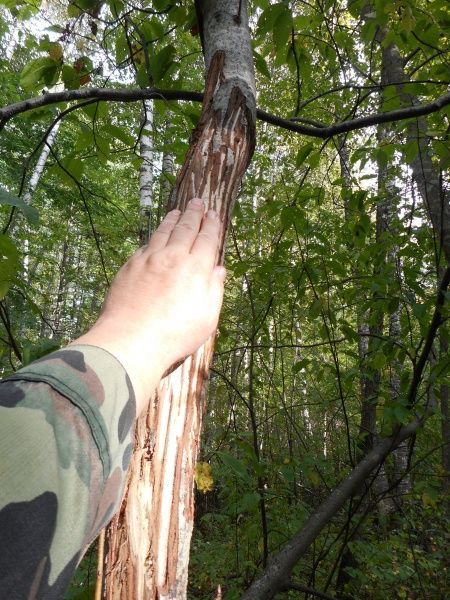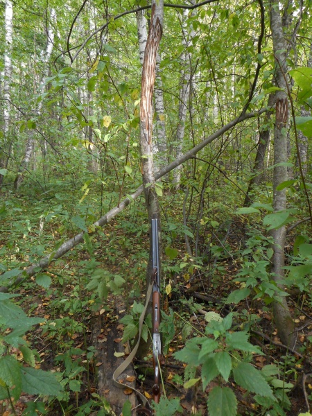 Медведь метит свои владения, сдирая кору деревьев. При этом он встает на задние лапы, чтобы как можно выше дотянуться. Делается это для того, чтобы показать пришельцам-сородичам, что хозяин тут громадный, связываться с ним не нужно, лучше обойти его участок стороной. Метки были не свежие, но хорошо различимые. Прислонил к дереву ружье и сфотографировал. Ружье длиной 1 метр 15 сантиметров, прикинул, что косолапый пометил дерево на высоте примерно 2 метра 35-40 сантиметров. Немаленький медведь. Я, при росте 1 метр 76 сантиметров, вытянув руку вверх до предела, до его верхних отметин дотянуться не смог.