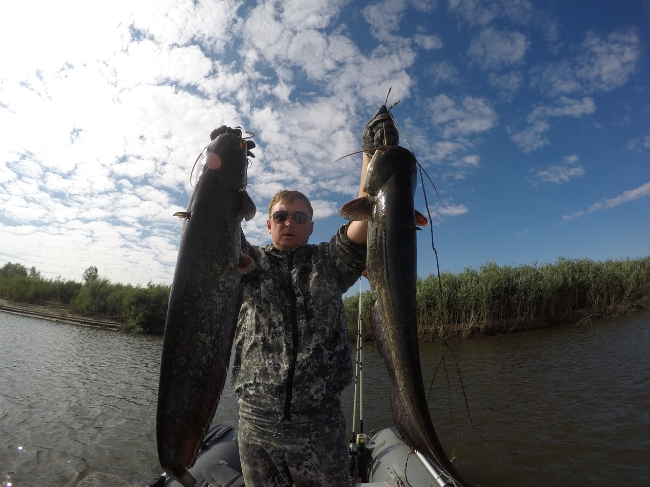 А с лодки на донки мы с ним поймали двух сомов (это я с ними на фото). На червя, кстати, взяли. Такое чудо выловили в Волге. Работы обоим хватило, попотеть пришлось! Зато потом и уха, и жареная рыбка была на обеденном столе.