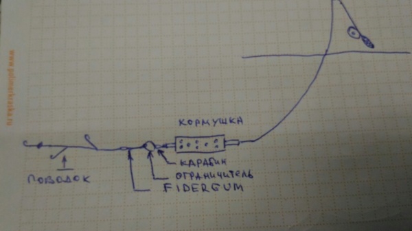 Леска внутри кормушки скользящая, как и на отдельных видах "кольцовки" с ограничителем. За счет этого заметны самые осторожные поклевки. Fidergum** служит в роли самоподсечки и в роли "фрикциона".