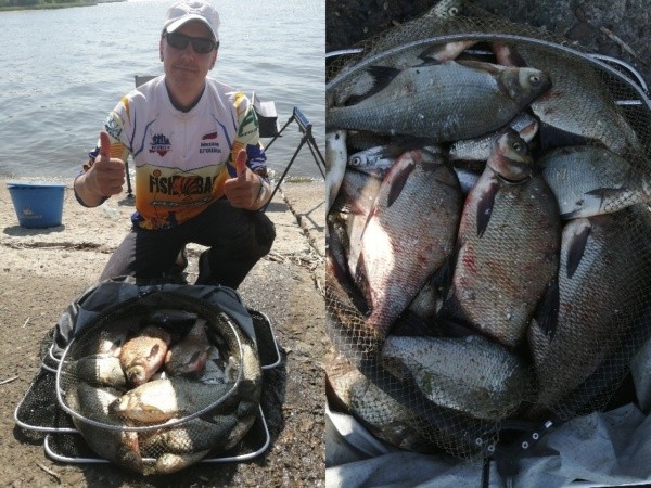 Начинаю работать с ближней дистанции и за час вижу четыре поклевки, которые успешно реализую – в садке два окуня и два подлещика. Соседи откровенно грустят. Решил уходить на дальнюю и там пытать счастья: первый заброс – пусто, второй – и сразу же поклевка влет, подлещик на 400 граммов красуется в подсаке. Понимаю, что рыба есть и крутится на точке, нужно лишь разобраться. Спустя полтора часа, проведенных на этой дистанции, создалось впечатление, что рыбы было… больше, чем воды: поклевки следовали каждые 40 секунд. Клевали подлещики от 300 до 800 граммов, даже сходы на точке не пугали собравшихся на угощение рыб.Каков улов, такое и настроение