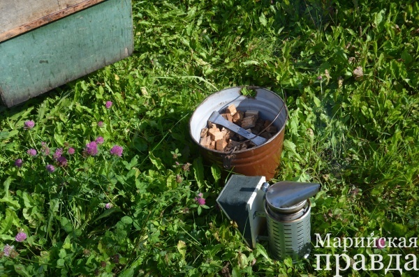 Судя по количеству пчел, так оно и есть - большинство крылатых работниц отправились за взятком, утихомирить остальных помогает дымарь, которым вооружена Настя. Дым от ольховых гнилушек хорошо успокаивает боевое охранение медовой кладовой. Сергей Сергеевич тем временем специальной стамеской выковыривает запечатанные забрусом рамки с медом – «печатка» это свидетельство того, что мед зрелый, а пчелок утиными перьями, которые идеально подходят для этого дела, сгребает обратно в улей.