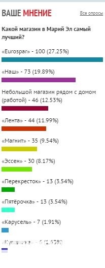 Уже неделю посетители покупатели голосуют за самую лучшую сеть супермаркетов, расположенных в Марий Эл. Лидеры - «Eurospar» и «Наш» - определились в первый же день, а вот третий претендент на победу в недельном рейтинге изменился.
