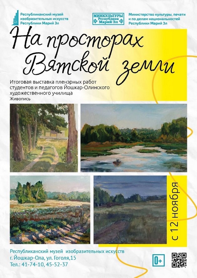 Завтра в 16.00 Республиканский музей изобразительных искусств представит вниманию посетителей выставку работ студентов и педагогов Йошкар-Олинского художественного училища «На просторах Вятской земли». Она стала итогом летнего пленэра «Вятская провинция − по святым местам», который не первый год проходит в поселке Знаменка Кировской области. Десять дней, проведенных там, вдохновили авторов на создание десятков этюдов, набросков и полотен.