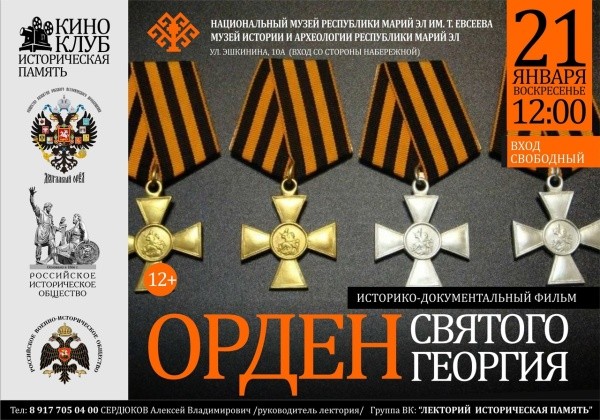 Первое в этом году заседание киноклуба «Историческая память», на которое приглашаются все желающие, состоится в Музее истории и археологии. Участники посмотрят историко-документальный фильм «Орден Святого Георгия» об истории военной награды и подвигах Георгиевских кавалеров, а затем обсудят фильм вместе с историками Марий Эл и устроят чаепитие.