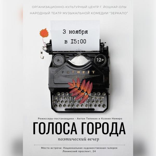 3 ноября в Национальной художественной галерее Йошкар-Олы в рамках акции «Ночь искусств» актёры Народного театра музыкальной комедии «Зеркало» представят поэтический вечер «Голоса города» (12+).