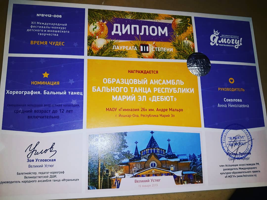 Лауреатом II степени международного конкурса "Я могу" в номинации «Лучший костюм» стал образцовый ансамбль бального танца Марий Эл "Дебют". За успехи, продемонстрированные в Великом Устюге, коллектив награжден дипломом и кубком.