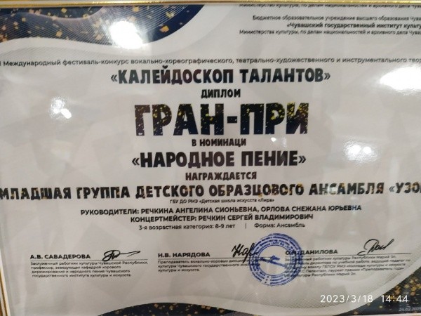 Ансамбль под руководством Ангелины Речкиной и Снежаны Орловой стал лучшим в номинации "народное пение". 18 марта юные вокалисты выступили на гала-концерте в концертном зале Чувашского государственного института культуры и искусств.