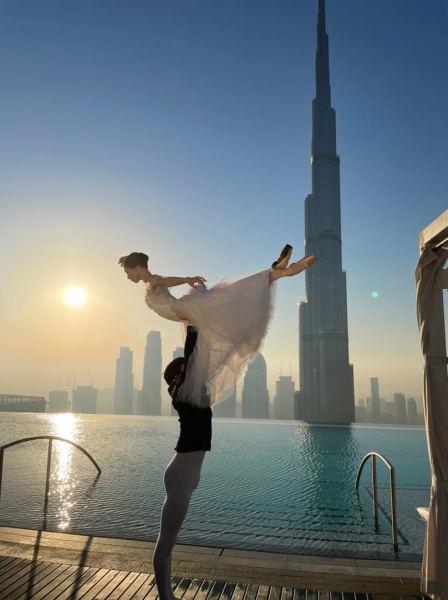Артисты балета фотографировались на фоне самого высокого здания в мире. В 7-30 утра прима-балерина Кристина Михайлова и премьер Артем Веденкин, исполнители главных партий в балете «Жизель», стали главными действующими лицами уникальной фотосессии компании «Emaar».