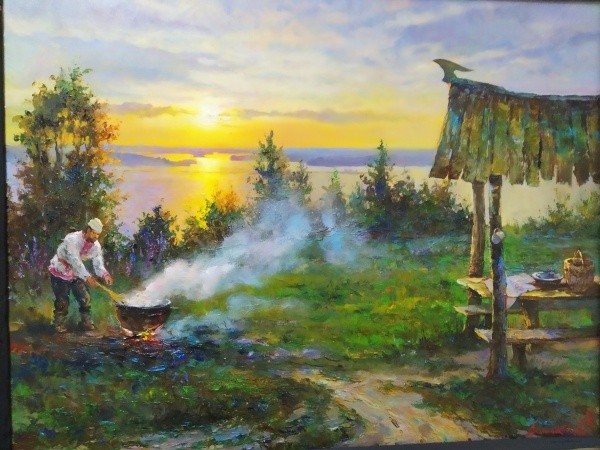 А насколько эта энергия обширна, можно увидеть на примере заслуженного художника Марий Эл Андрея Санникова. На выставке представлены и его картины с этого пленэра. Но ведь он не выезжал со всеми! Дело в том, что художник поддерживает свою дочь, а когда она уехала на Волгу, звонил ей, получал фотографии натуры, изучал этюды, слушал восторженные отзывы…– Это вдохновило меня на две картины. Конечно, это не копии с фотографий. К примеру, в картину «Вечер на Волге» с фотографии вошел лишь закат. Мужчину, жарящего шашлыки, заменил на рыбака, одел его в национальный костюм, беседку «состарил», – объяснил он.– Планируете создать серию?