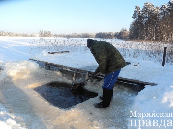 После Божественной литургии совершается крестный ход и водосвятный молебен на «иордани» – проруби в форме креста. В Йошкар-Оле - на реке М. Кокшага у Вознесенского собора.