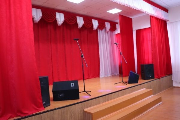 Сцена получила новую одежду, освещение, в зале стоит новая мебель, а окна украшают красивые шторы.