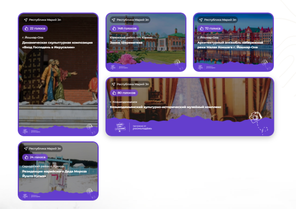 От Марий Эл заявлены замок Шереметева, динамическая скульптурная композиция «Вход Господень в Иерусалим», архитектурный ансамбль набережной реки Малая Кокшага в Йошкар-Оле, Козьмодемьянский культурно-исторический музейный комплекс и резиденция марийского Деда Мороза Йӱштӧ Кугыза.