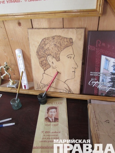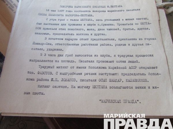 - Музей открылся в 1992 году. На стендах собраны оригиналы фотографий: они рассказывают и о его творческом пути, и о кончине Шкетана, запечатлены даже его похороны. На столе лежит журнал с вырезками из газет, есть здесь и материал из газеты «Марийская правда», в котором говорится о том, как хоронили писателя.