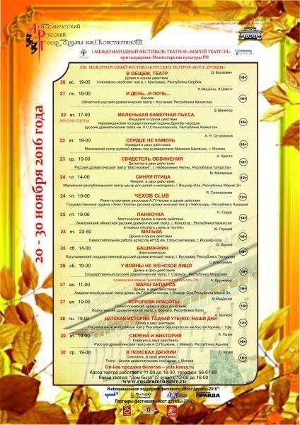 В воскресенье, 20 ноября, в Йошкар-Оле на сцене Академического русского театра им. Г. Константинова откроется фестиваль русских театров «Мост дружбы».