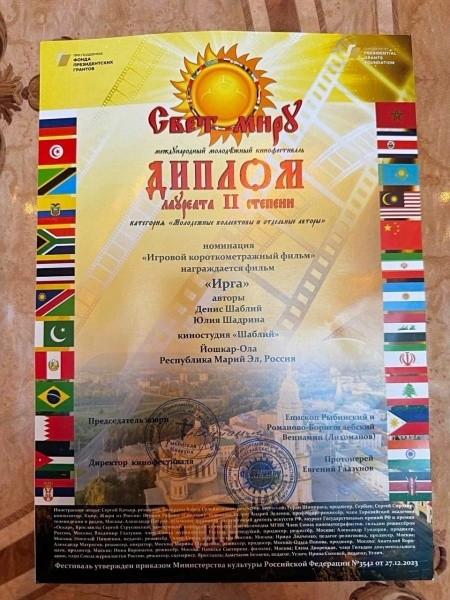 Режиссер Денис Шаблий поделился радостной новостью: фильм «Ирга», снятый в Марий Эл, стал обладателем второго места на Международном молодежном кинофестивале «Свет миру».