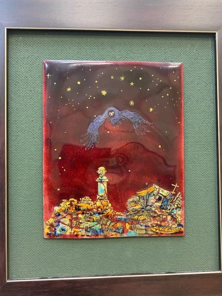 Конечно, эмальеров сегодня хватает, на рынке можно увидеть немало ювелирных украшений, декоративных изделий. Но художники-живописцы по эмали уровня Сафиуллина – на вес золота. Его финифть иногда схожа с акварельной работой, иногда кажется, что рисунок выхвачен из самой природы.К примеру, я попросила двух искусствоведов и нескольких студентов Йошкар-Олинского художественного училища показать мне на выставке особенно понравившуюся им финифть, и все указали на «Суматошный день» (медь, перегородчатая эмаль). Этот шедевр похож на разрез природного самоцвета, на котором расплывчатые и завихренные линии отдаленно напоминают деревья, дорогу, силуэт человека. Лично меня потряс пейзаж «Зимушка», на котором горячей эмалью прорисовано в деталях старинное заснеженное село с храмом и небом цвета желтого янтаря. В его финифти с картинками сельского быта почти всегда присутствует легкий юмор. Но иногда будоражит что-то космическое, красно-тревожное, к примеру, «Полет совы». Конечно, у Сафиуллина были свои секретные нюансы технологии горячей эмали, приобретенные на собственном опыте. Думается, передал их своим детям - Чингизу и Анастасии, работавших с ним в этом направлении. Остается надеяться, что свое очарование финифтью Мастер передаст и нашим марийским юным художникам, коих на выставке было много.