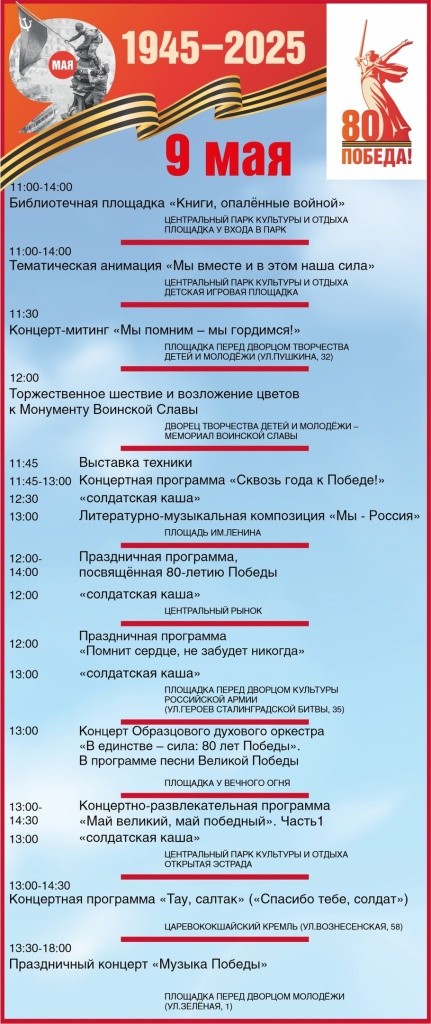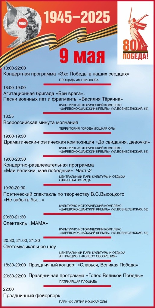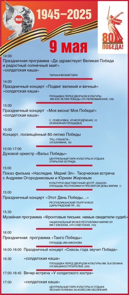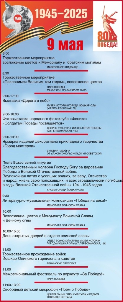 Администрация Йошкар-Олы опубликовала программу празднования 9 мая на всех городских площадках. Для удобства читателей мы выбрали самые важные, на наш взгляд, мероприятия, которые нужно посетить.