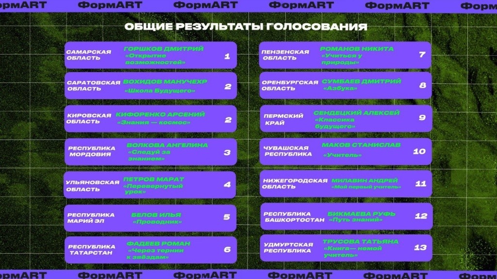 Победителем конкурса стал представитель Самарской области Дмитрий Горшков со стрит-артом «Открытие возможностей». Второе и третье места заняли Манучехр Вохидов из Саратовской области («Школа Будущего»), Арсений Кифоренко из Кировской области («Знания — космос») и Ангелина Волкова из Республики Мордовия («Следуй за знанием»)