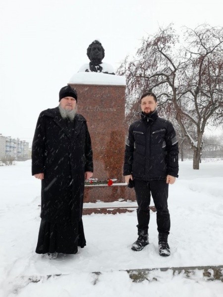 Провел панихиду настоятель храма «Всех скорбящих Радость» протоиерей Александр Михайлов. После этого священнослужитель возложил цветы к бюсту Пушкина на центральной площади Волжска.