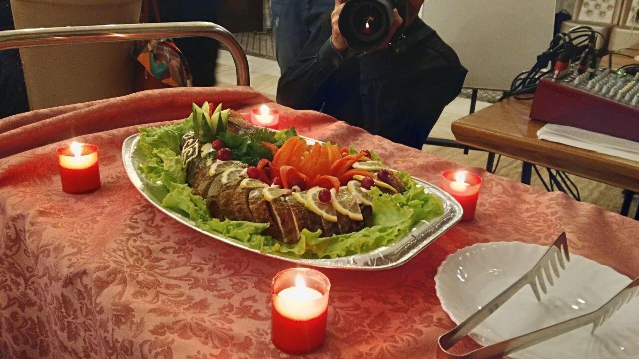 А теперь, собственно, о кухне. Первыми в бой пошли салаты и закуски. Перечислю лишь то, что мне особенно запомнилось. Особой популярностью пользовался гехакте лебер – нежный куриный паштет в овощах и зелени. Под спиртное хорошо шли кусочки ржаного хлеба с форшмаком – аппетитным паштетом из сельди. А нашинкованные куриные яйца, политые соусом («В оригинальном рецепте это должен быть гусиный жир», - заметил мой сосед по столу Леонид Хает) закончились одними из первых. Кстати, к холодным блюдам были очень уместны ломтики нескольких видов деликатесных сернурских сыров. На горячее подали чолент – тушеное мясо с фасолью и картофелем. Сладости к чаю я перечислять не стану. Упомяну лишь умопомрачительные, скромные на вид, вафельные ореховые пирожные, которые пользовались особым спросом. Однако наибольший ажиотаж, восхищение и аплодисменты вызвала торжественно представленная на выкатном столике с зажжёнными свечами знаменитая «гефилте фиш» – фаршированная рыба.
