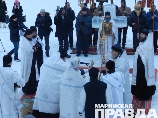 После Литургии на реку Малую Кокшагу был совершен крестный ход, здесь прошло великое освящение воды. Здесь во льду заранее была сделана иордань - прорубь крестообразной формы, в которую после недолгой службы священник трижды с молитвами опустил крест. Святой водой окропили всех, кто пришел на берег Малой Кокшаги.