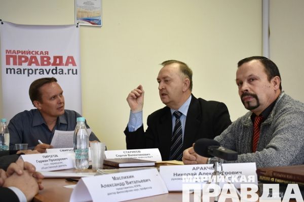 Дебаты прошли в нашей редакции и транслировались в прямом эфире на сайте «МП». В обсуждении событий 1917 года, причин революции и ее уроков участвовали доктор исторических наук, профессор МарГУ Сергей Стариков, который занял место рядом с председателем Марийской ассоциации жертв политических репрессий Николаем Аракчеевым, доктор философских наук, профессор, первый секретарь Йошкар-Олинского отделения КПРФ Александр Маслихин, а также поэт, переводчик, общественный деятель Герман Пирогов, занявший за столом позицию между модератором встречи, журналистом Сергеем Смирновым и представителем компартии.