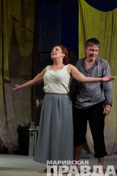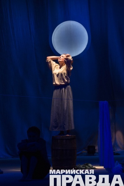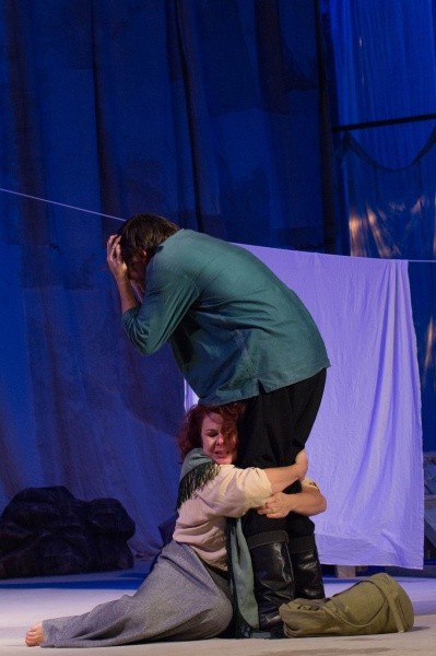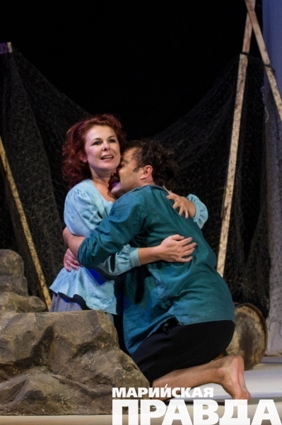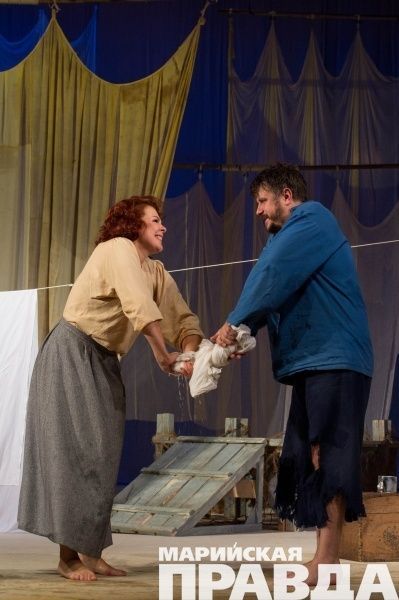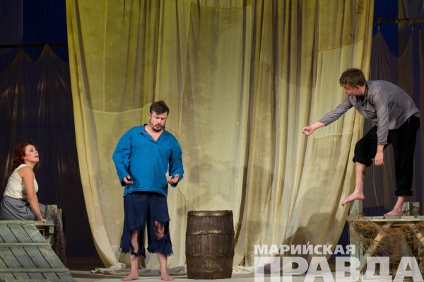 Вот оно - море, символично исполненное в виде большого куска светлой ткани, закрепленного над сценой, вот коса, где любят коротать дни наши герои, и кажется, что уже слышишь крики чаек, звучащие над водой.