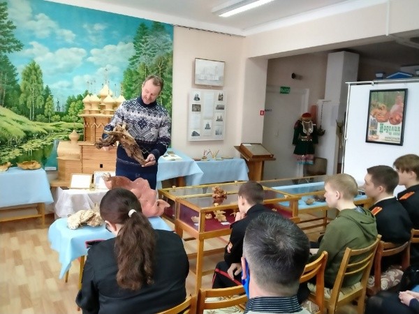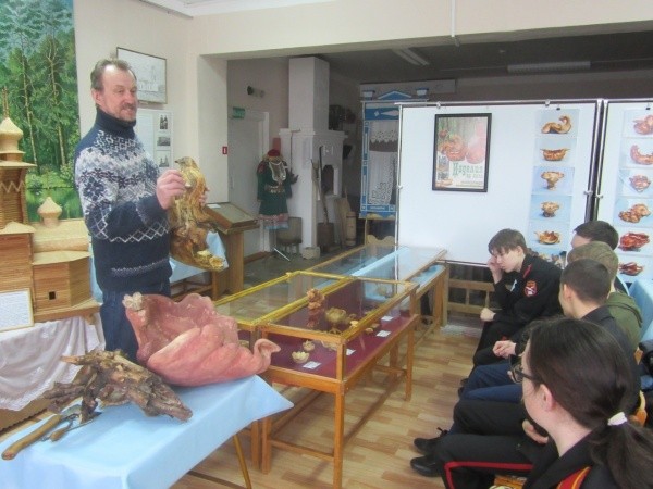 В Куженерском районно-выставочном центре учащиеся школы встретились с умельцем, мастером обработки капов и сувелей Павлом Николаевым. В музее недавно проходила выставка его изделий.