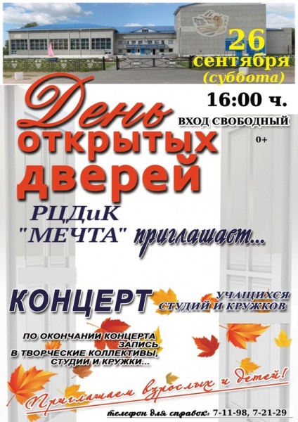 Культурное учреждение Марий Эл Звениговский районный Центр "Мечта" проводит в конце сентября день открытых дверей, вход свободный.