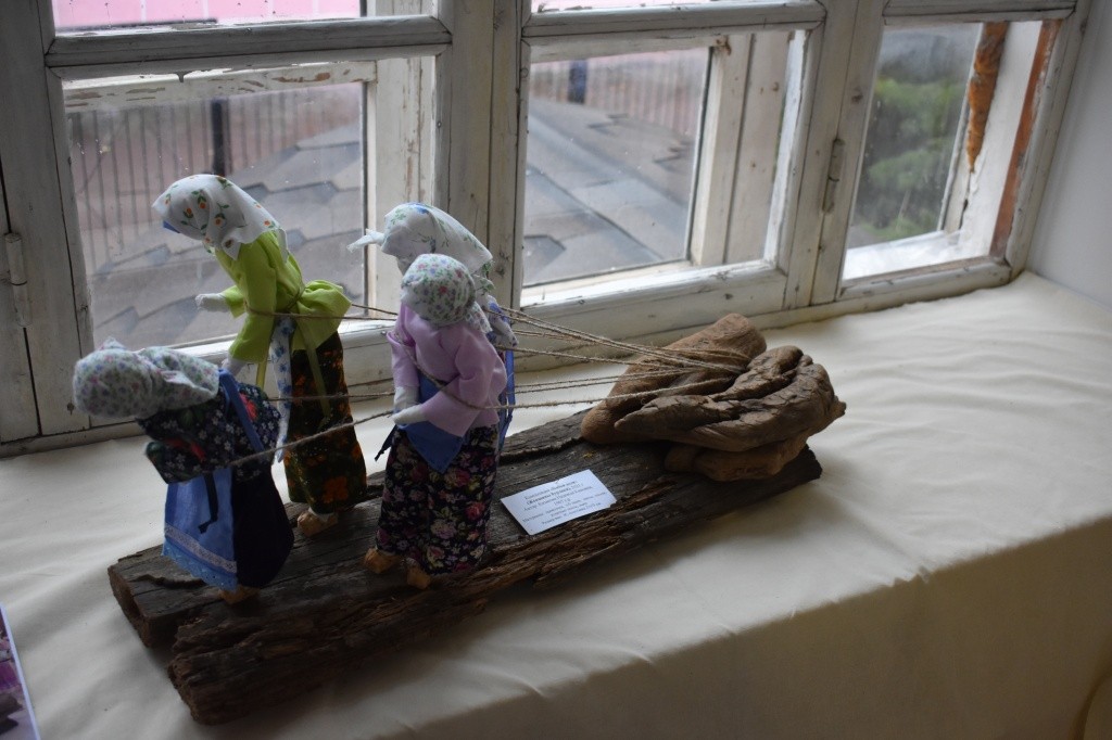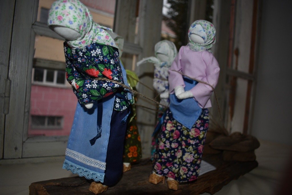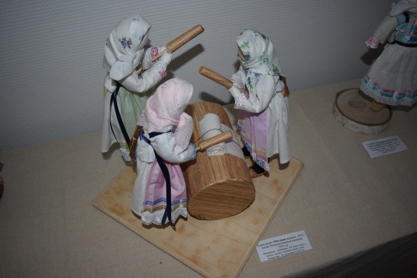 Вот, к примеру, композиции мастерицы из Козьмодемьянска Надежды Казаковой «Мягчение холста» и «Бабья доля». Особенно хочется остановиться на второй, изображающей женщин, изможденных делом, тянущих лямку тяжелого труда. У кукол нет лиц, но и по опущенным головам и согбенным спинам понятны их страдания и каторжная работа.