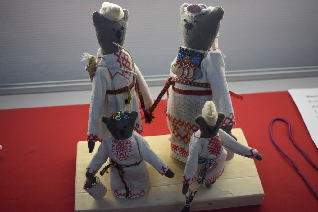 Необычными выглядят работы рукодельницы из Свердловской области Татьяны Жарковой, которая представила на выставку семью медведей в национальных нарядах. Такие куклы можно отнести к игровым. Мишки получились очеловеченными: хозяин леса – с луком и колчаном за спиной, мама-медведица и дочка – с берестяными туесками, а маленький мишка – с веничком.