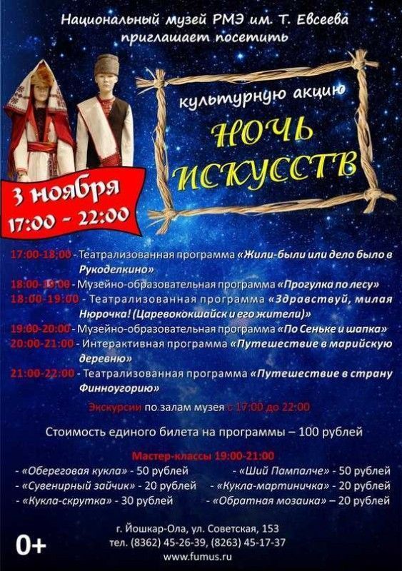 Всероссийская акция «Ночь музеев» проводится по всей стране и даже за ее пределами, как известно, весной. Национальный музей им. Т.Евсеева и Музей народно-прикладного искусства организуют для своих посетителей «внеплановую» «Ночь искусств» 3 ноября.