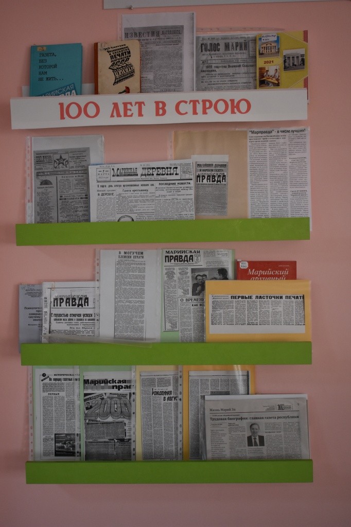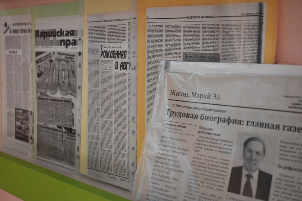 − Выставка – это тот самый уголок, который рассказывает историю газеты. Для этого работали с нашим краеведческим каталогом, архивами. Есть и новые экспонаты, например, статья о том, что «Марийская правда» в этом году вошла в десятку лучших газет России. Хотелось показать, чем наше марийское издание заслужило войти в этот рейтинг. Люди приходят, удивляются: как так, газете 100 лет уже? Интересно! Видя интерес в глазах посетителей, подхожу и рассказываю об этом. История вся налицо – вот на этих полочках, − улыбаясь, говорит Елена Петрова.