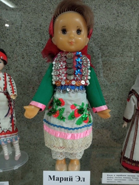 Со стеклянных витрин на гостей библиотеки своими пластмассовыми глазами смотрят куклы в национальных костюмах из Советского Союза. Они сразу узнаются по внешнему виду и одежде. Кукол делали из безопасных материалов, и на заводе были очень строгие требования к пластикам, красителям и наполнителям, рассказывает главный библиотекарь Центра чтения Ирина Нагибнева.