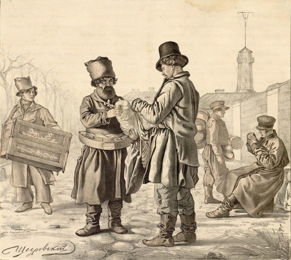 Впрочем, между потребителями и не всегда чистоплотными пирожниками порой случались словесные перепалки. Например, ест мальчик пирог с вареньем и ему попадается кусок грязной тряпки. "Он, обращаясь к пирожнику, говорит: "Дяденька, у тебя пироги-то с тряпкой...". Пирожник в ответ: "А тебе, каналья, что же, за две копейки с бархатом, что ли, давать?"Другие разносчики, водрузив на голову длинные лотки, покрытые теплыми одеялами, в определенные часы приходили в торговые ряды и на разные голоса громко выкрикивали названия своих товаров. Беднота покупала у них жареную телятину или баранину с картошкой, мозги с соленым огурцом, кишки, начиненные гречневой кашей и обжаренные в бараньем сале, белугу с хреном и красным уксусом; горячую ветчину, колбасу, сосиски; гречневую либо пшенную кашу. Все накладывалось на блюдце, а вместо вилки прикладывалась оструганная щепочка. Через час разносчики проходили обратно и собирали каждый свои блюдца.